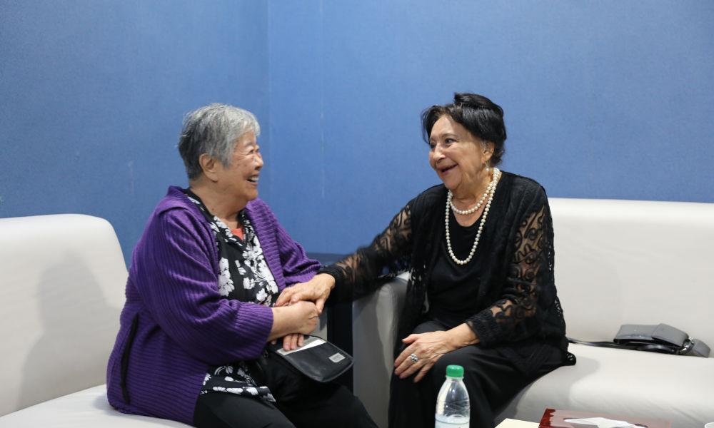 2024年10月9日,“人民音乐家”冼星海之女冼妮娜(左)和哈萨克斯坦音乐家拜卡达莫夫之女拜卡达莫娃阔别5年后在武汉约见。新华社发(刘天一摄)