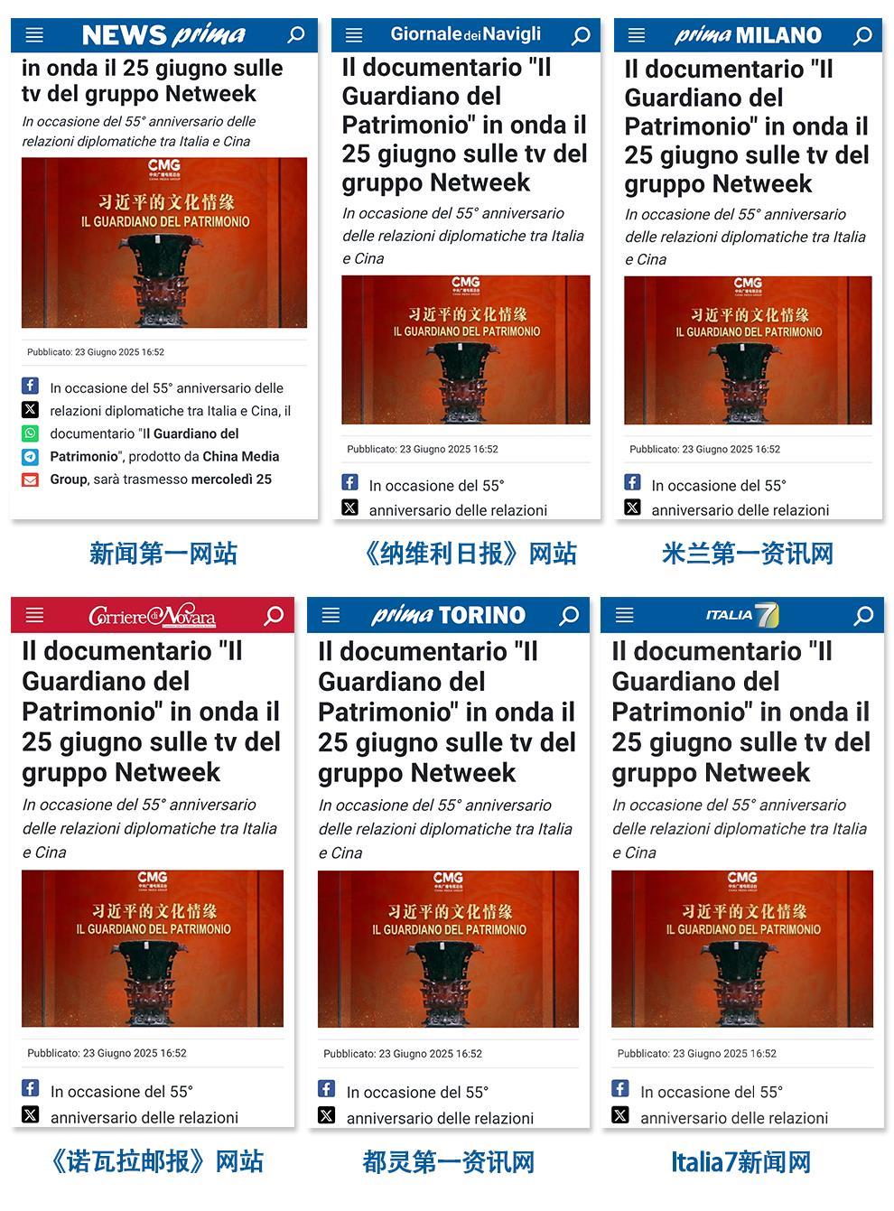 在中意建交55周年之际,由中央广播电视总台制作的专题片《习近平的文化情缘》,当地时间6月25日起在意大利阿尔玛电视台、拉齐奥电视台、《米兰财经报》网站等主流媒体平台上线播出。意大利新闻第一网站、《纳维利日报》网站、米兰第一资讯网等40多家主流媒体对节目播出进行预告,受到意各界广泛关注。