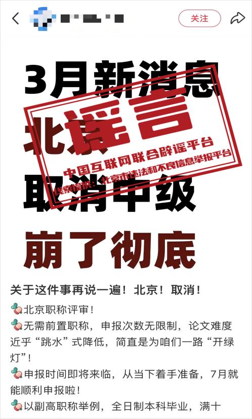 详情:近期,2025年度职称评审工作启动后,网上流传“北京取消中级职称”的说法。经核实,此言论不实,中级职称并未取消。据北京市人社局介绍,申报人可以对照初级、中级、高级职称不同层级的要求,根据自身情况申请职称评审。不同系列的职称申报具体要求不同,以工程技术系列为例,本科毕业需要先取得中级职称,获评中级职称后从事本专业技术工作满5年,才能申报高级职称。(来源:“北京网络举报”微信公众号)