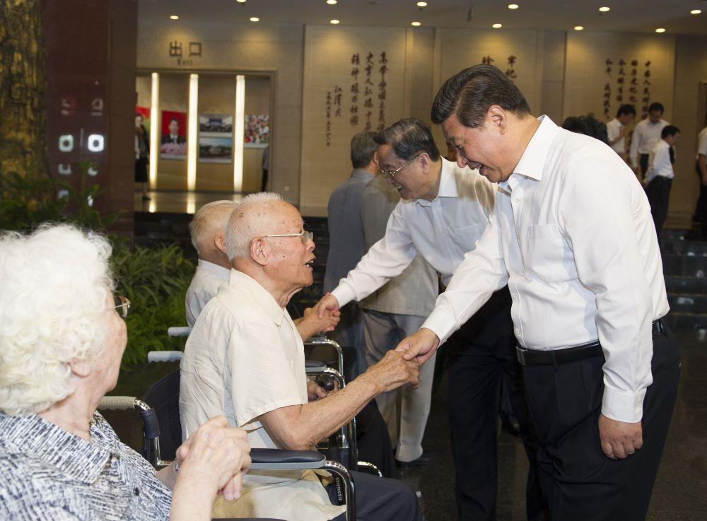 2014年7月7日,首都各界在中国人民抗日战争纪念馆隆重集会,纪念全民族抗战爆发77周年。习近平出席纪念仪式并发表重要讲话。这是参观结束后,习近平等亲切看望参加仪式的抗战老战士和老同志代表。