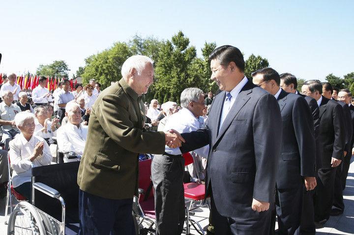 2014年9月3日上午,习近平与抗战老战士和老同志、抗战烈士亲属、为抗战胜利作出贡献的国际友人遗属代表亲切会面。