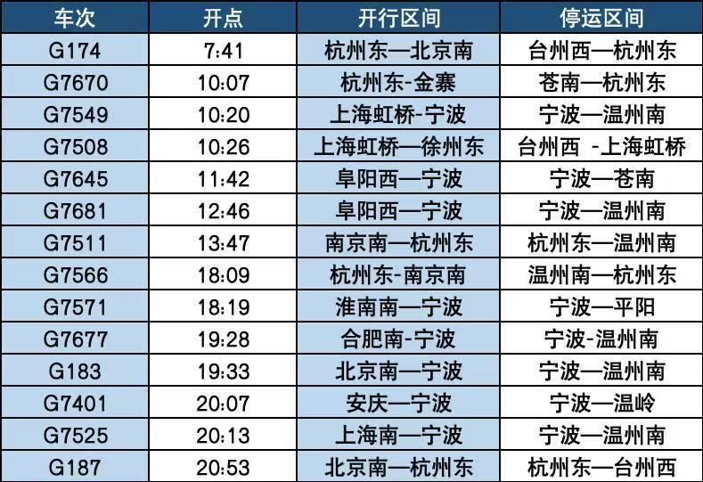 为确保铁路运输和旅客出行安全,铁路部门计划对7月8日途经杭深高铁G7599、 G7521次等旅客列车,对7月8日途经杭台高铁G7503 、G7575次等旅客列车,对7月8日途经杭温高铁C3633、G7581次等旅客列车,对7月8日途经金温线G7367、 G7467次等旅客列车,采取临时停运措施。