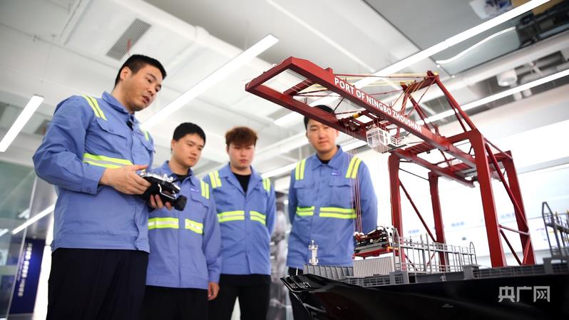 竺士杰(左一)为同事讲解智能桥吊操作原理(央广网记者 尚天宇 摄)