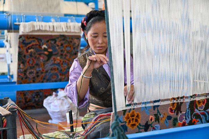 2025年7月18日,江孜藏毯文化发展有限责任公司的员工在生产车间内编织藏毯。西藏日喀则市江孜县是著名的藏毯(藏族称为“卡垫”)之乡,织毯历史悠久。藏族卡垫织造技艺于2006年被列入国家级非物质文化遗产代表性项目名录。近年来,江孜藏毯在守护传统技艺的同时积极创新,通过建立合作社、开办技能培训班等方式扩大灵活就业规模,让更多人在家门口织藏毯增收。