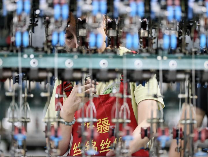 2025年7月29日,工人在新疆丝锦丝绸纺织有限公司生产车间内的自动缫丝机上作业。近年来,新疆塔城地区乌苏市引进桑蚕茧丝绸智能化全产业链项目,鼓励农民种桑养蚕,拓宽兴边富民新“丝”路。