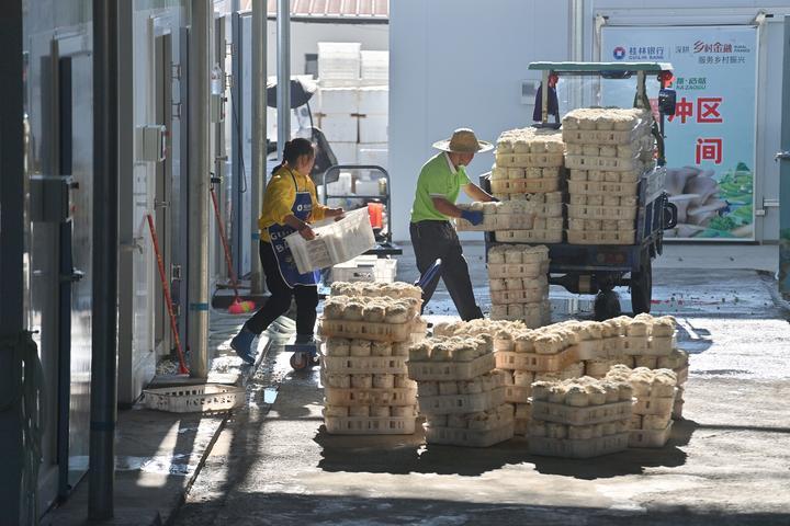 2024年10月31日,村民在广西百色市德保县那造村食用菌生产基地搬运采摘的蘑菇。那造村通过做优特色产业、丰富村民生活、完善基础设施等多项具体举措,推动各项事业快速发展。