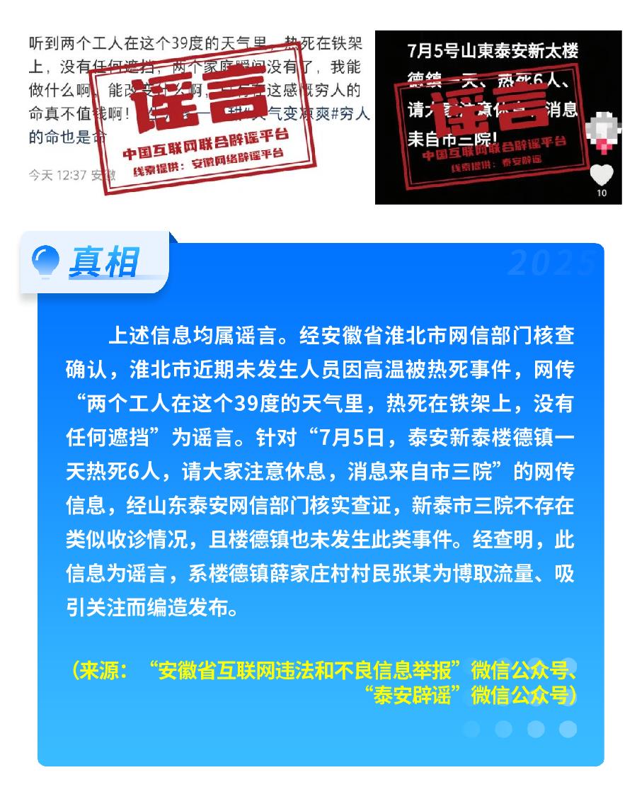 近期,网上接连出现发布虚假“警情通报”的恶性造谣传谣案件,炮制传播“昆明驾车撞人案131人死亡”“杭州自来水接入粪水”及涉释永信虚假“警情通报”,模仿“蓝底白字”格式,杜撰耸人听闻细节,损害政府公信力,严重扰乱社会秩序。“院士预测广东将发生8级以上大地震”公然伪造专家聊天截图,谎报地震预警。还有造谣者借盛夏高温酷暑与洪涝灾害,编造“安徽淮北、山东泰安等地多人因高温死亡” “重庆大暴雨导致15人死亡、4人失踪”等谣言,蹭炒热点、煽动情绪。