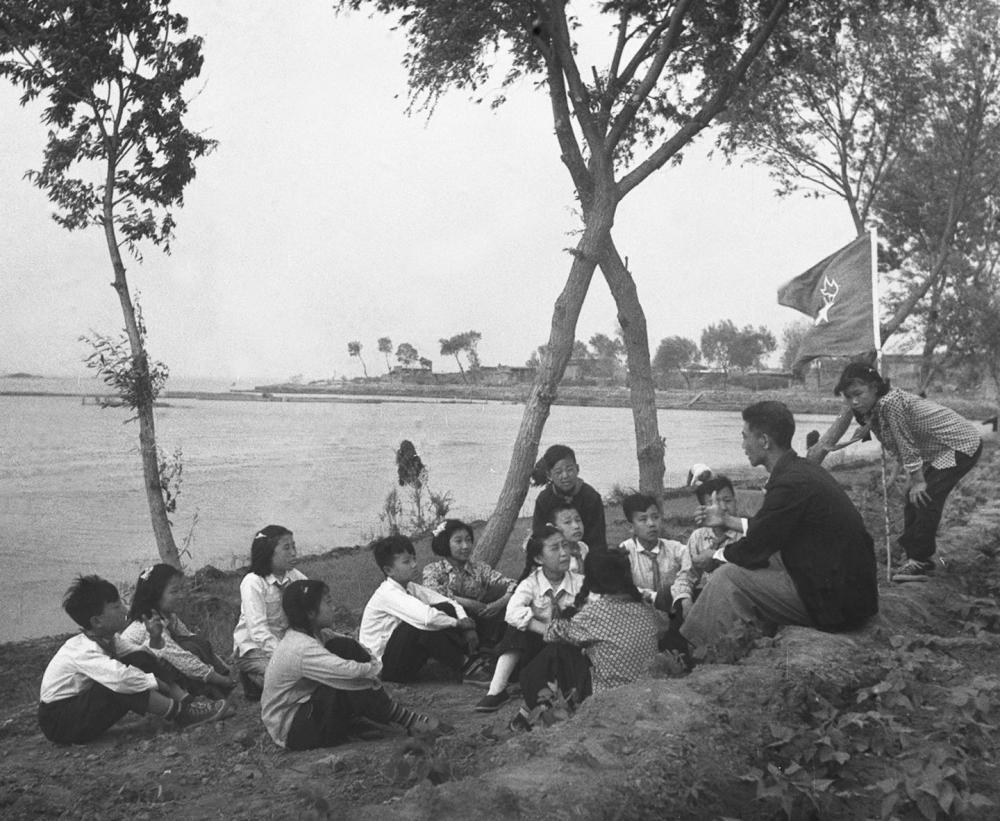 1955年,在河北白洋淀,新安小学的少先队员们听曾担任过抗战时期儿童团团长的陈殿元讲抗战故事。
