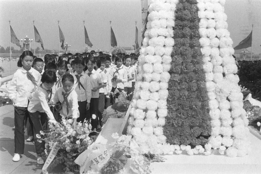 1985年,首都各界代表在天安门广场人民英雄纪念碑前举行献花圈仪式,追念在抗日战争中牺牲的将士和死难同胞。这是海淀区少先队员在敬献花圈。