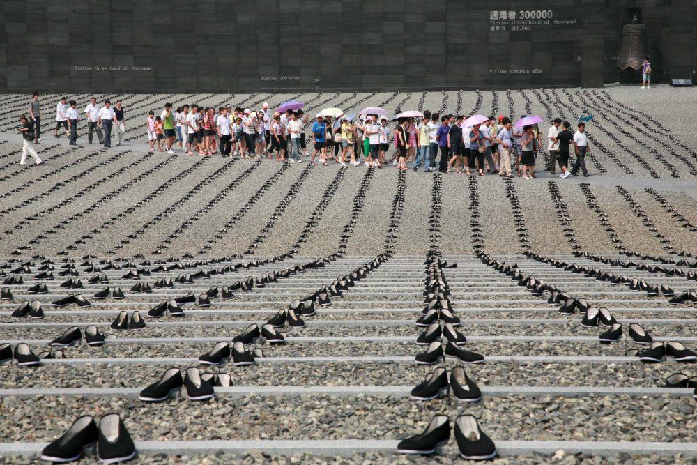 2010年8月15日,在侵华日军南京大屠杀遇难同胞纪念馆的和平公园,6830双布鞋被整齐摆放,纪念在日本遇害的中国劳工。