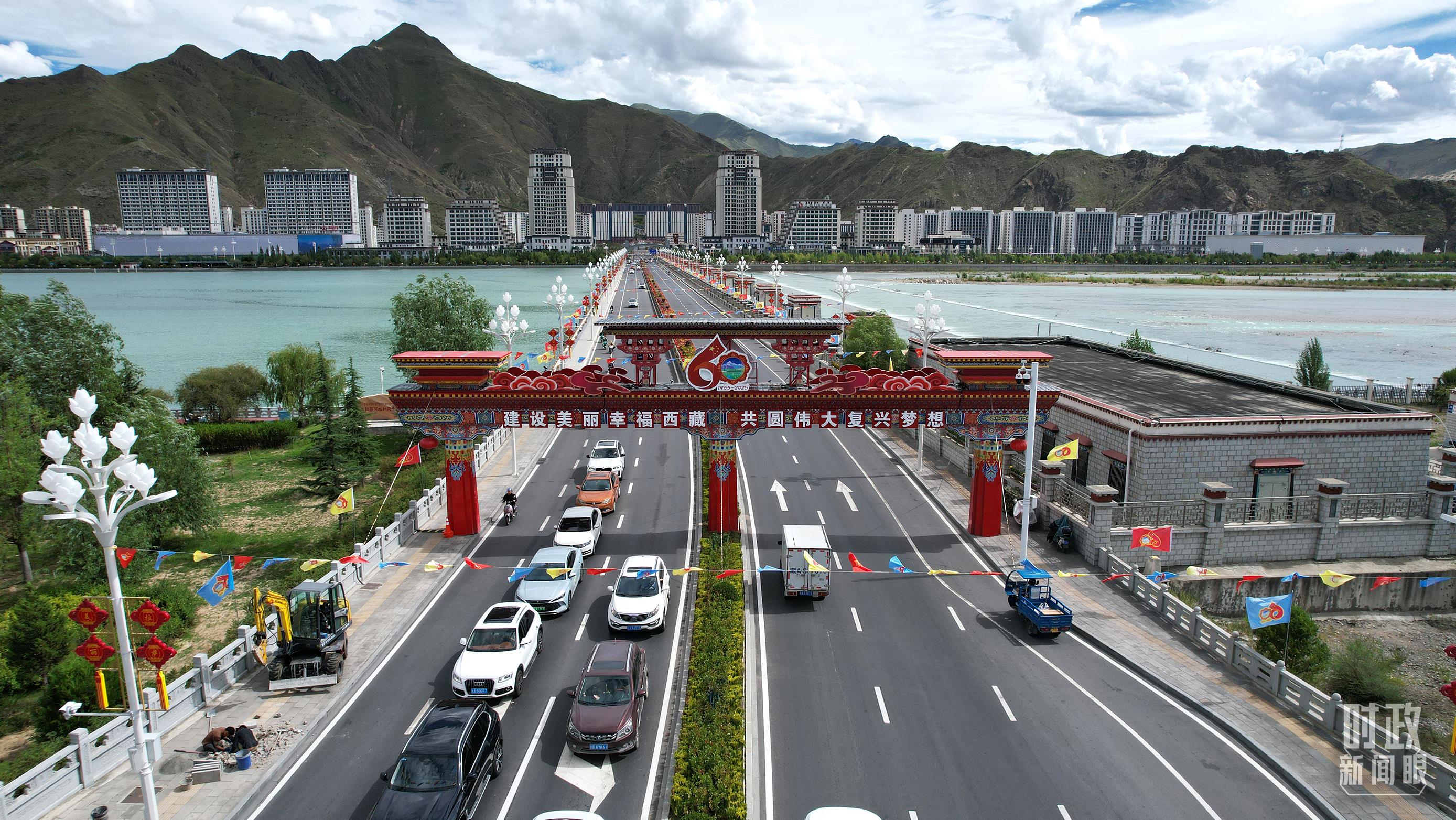 充满节日氛围的古城拉萨,从机场到住地主要街道两旁彩旗舞动,各族群众手持红旗、捧着哈达,齐声欢呼。