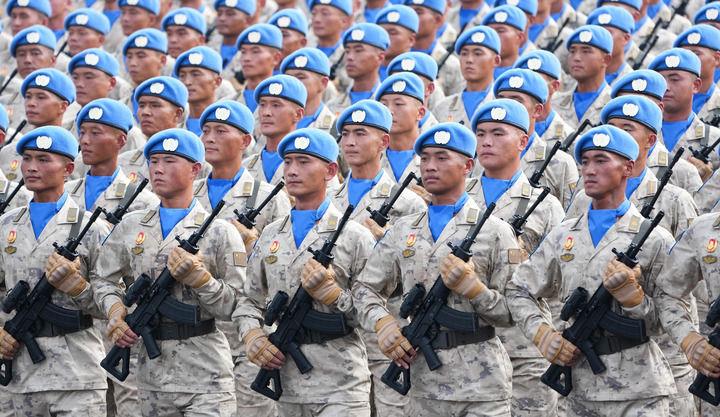 维和部队方队官兵头戴蓝色贝雷帽、脖系蓝色丝巾,目光如炬、步履坚定走过天安门广场。