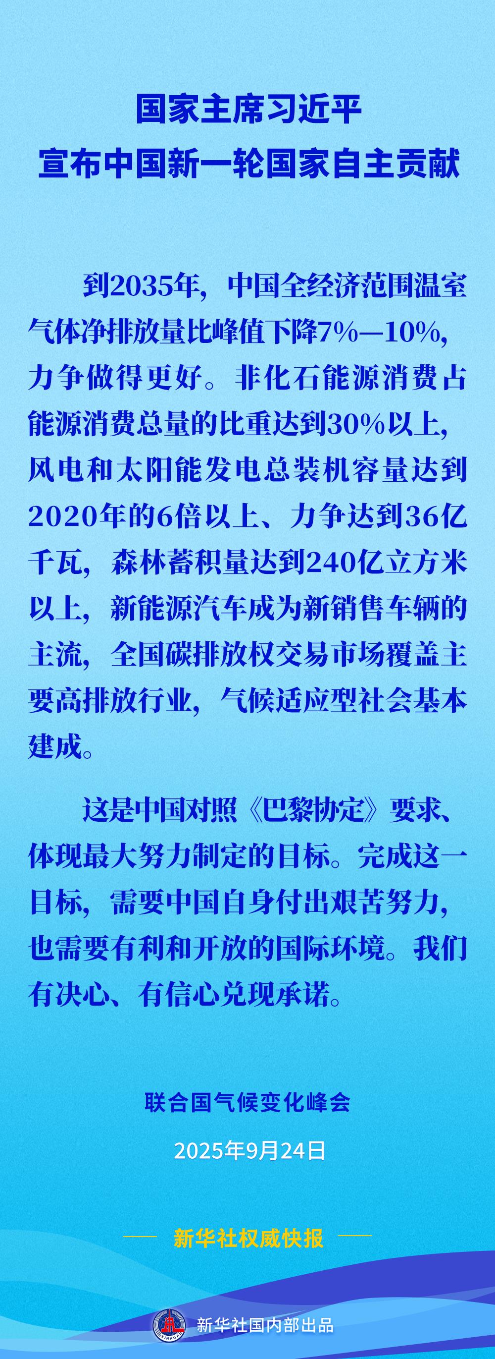 9月24日,习近平主席在联合国气候变化峰会发表视频致辞时,郑重宣布中国新一轮国家自主贡献。
