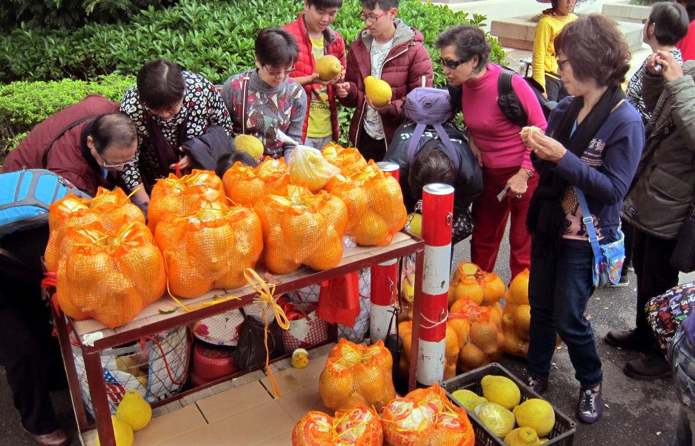 2012年12月29日,游客在广东省梅州市选购柚子。