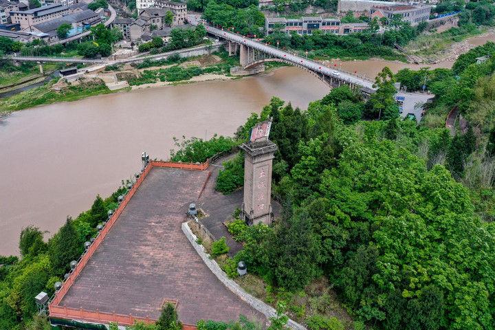 位于赤水河畔的贵州省遵义市习水县土城镇,是赤水河中游的重要码头,同时也被称作“躺在纪念馆上的红色小镇”。1935年,中央红军在土城一渡赤水河,拉开了四渡赤水战役的序幕。这是2021年4月21日拍摄的土城渡口纪念碑(无人机照片)。