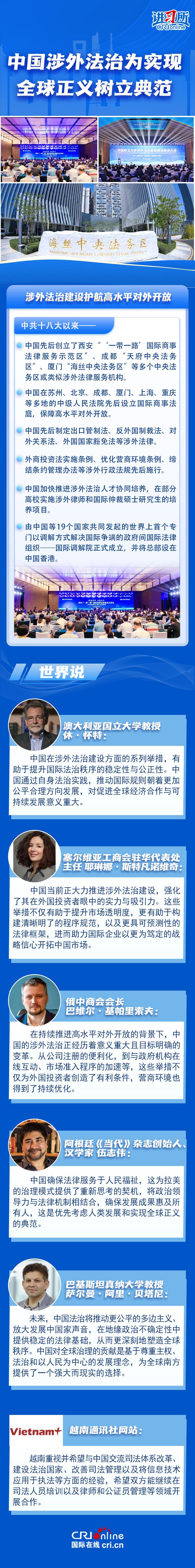 今年10月,中共二十届四中全会审议通过的“十五五”规划建议提出,要加快涉外法治体系和能力建设,健全国际商事调解、仲裁、诉讼等机制,并将“社会主义法治国家建设达到更高水平”列入中国未来五年经济社会发展的主要目标之一。国际社会认为,中国在涉外法治建设方面的系列举措,确保发展成果惠及所有人,为实现全球正义树立了典范,有助于提升国际法治秩序的稳定性与公正性,推动国际规则朝着更加公平合理方向发展。