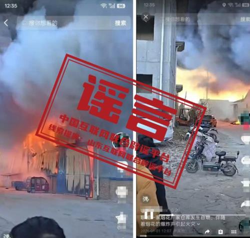真相:近日,有网民称“聊城一烟花厂仓库发生自燃”,相关火灾及爆炸视频在网上流传。经调查,该信息不实。实为网民石某某为博取眼球,使用自己的账号编造并发布该谣言,引发当地居民恐慌,造成不良社会影响。当地公安机关依法给予石某某行政处罚。(来源:“山东互联网联合辟谣平台”微信公众号、聊城市网上辟谣平台)