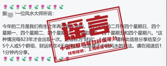 真相:这些言论是典型的网络谣言。平年的2月都有28天,正好是4个完整的星期,这28天里必然包含4个周一、4个周二……直到4个周日。不用间隔823年,任何一个平年,都符合网传信息所谓的“特殊”要求。可见,“特殊月份”压根不特殊,“823年才能遇到一次”更是无稽之谈,与财运等迷信说法无关。类似谣言不是第一次出现,每隔数年就有一个新版本,其实是把常见的历法现象包装成难得一遇的情况,再通过“转发获财运”等诱导话术传播,实现网络营销。(来源:“上海网络辟谣”微信公众号)