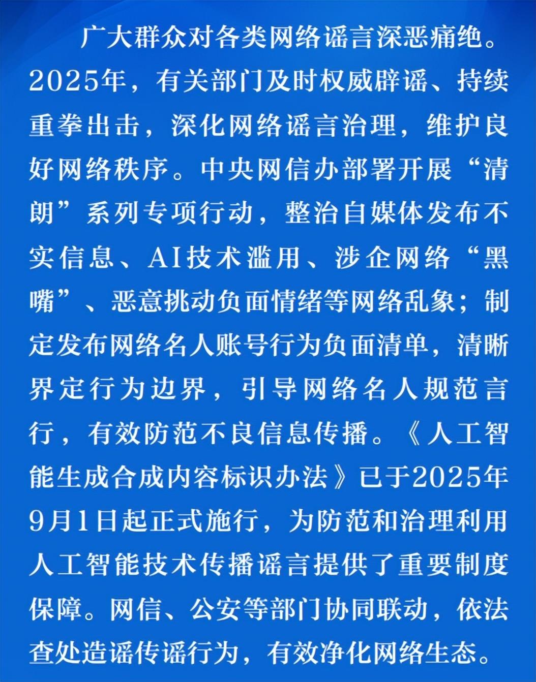 回顾2025年,在公共政策、社会事件、经济金融、灾害事故、科学知识等公众关心关切领域,网络谣言不时滋生蔓延。随着人工智能(AI)技术浪潮汹涌,越来越多的网络谣言搭上AI的“快车”,歪曲事实、误导认知,污染网络空间。