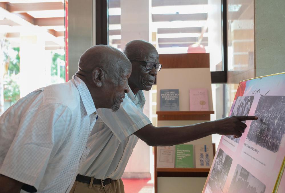 1月28日,在津巴布韦首都哈拉雷的中国大使馆,两名曾在中国接受培训的津巴布韦老战士在展板老照片上寻找自己。当日,大使馆举行向津巴布韦解放斗争老战士转交习近平主席复信活动。新华社记者 杨光 摄