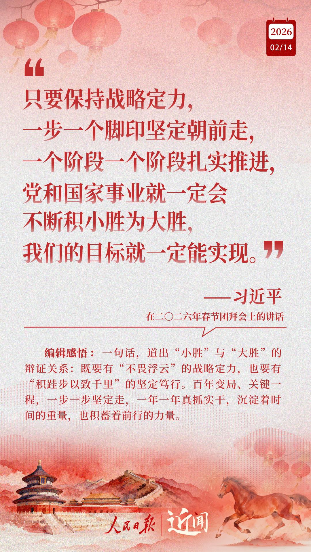 春暖情长,新春又至。2月14日,腊月廿七,习近平总书记在二〇二六年春节团拜会上发表重要讲话。“一步一个脚印坚定朝前走”“一切工作都是为了人民的幸福”“在中国式现代化新征程上策马扬鞭、勇往直前”……送祝福、话成就、谈未来,“十五五”开局起步之际,总书记这些暖心话饱含深意。