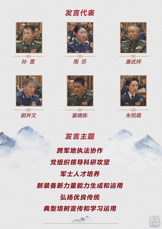 会上,孙雷、周芬、唐武祥、郝井文、姜晓栋、朱悦萌等6位代表先后发言,分别就跨军地执法协作、党组织领导科研攻坚、军士人才培养、新装备新力量能力生成和运用、弘扬优良传统、典型培树宣传和学习运用等提出意见建议。