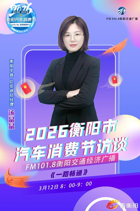 “智汇衡阳·驭见未来”2026衡阳市汽车消费节将于3月13日至15日在市体育中心举行。3月12日上午,衡阳中意比亚迪总经理汤晶晶做客FM101.8衡阳交通经济广播《一路畅通》栏目,向消费者全方位揭秘2026衡阳汽车消费节期间比亚迪品牌的热门车型与专属优惠政策。