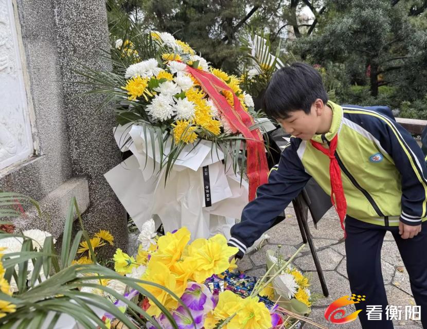 “准备着,为共产主义事业奉献力量!”默哀结束后,全体学生高举右拳,重温入队誓词,坚定的声音在纪念碑前回荡,彰显出传承红色基因的决心。随后,学校负责人兼少工委主任深情讲述衡阳保卫战历史,号召全体师生要以英烈为榜样,从红色基因中汲取力量,勇担时代使命,成为有理想抱负的好少年。仪式结束后,师生代表有序向纪念碑敬献白菊,表达对先烈的深切追思。
