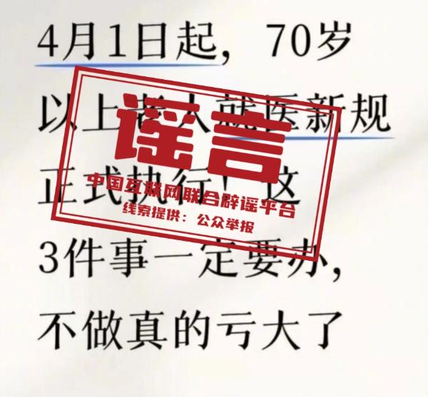 中国互联网联合辟谣平台进一步向国家卫健委有关部门核实确认,网传“70岁老人就医新规”相关信息系谣言。(来源:中国互联网联合辟谣平台、@南方日报、“新闻坊”微信公众号)