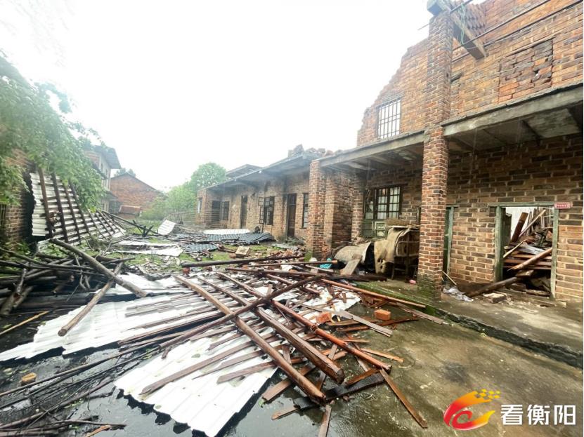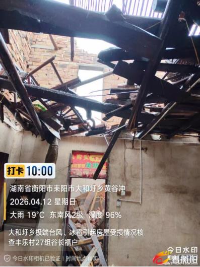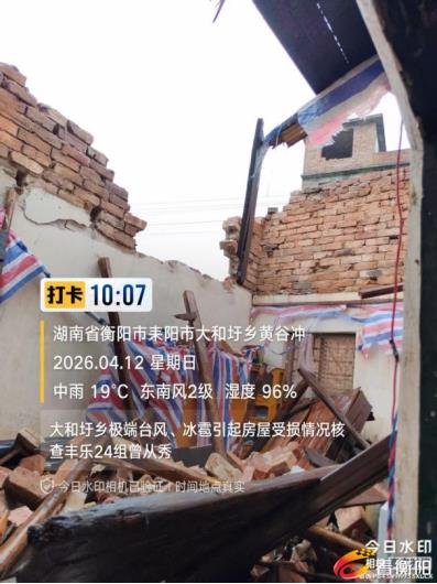 4月10日下午,耒阳市大和圩乡遭遇极端强对流天气,突发10级以上台风,伴随冰雹、暴雨和短时强降水。导致丰乐、樟田、莲花、五和等8个村100多户农户房屋受损,大量农房屋顶被掀翻、部分村民墙体开裂甚至倒塌,大树被刮倒堵塞交通,大片油菜等农作物受损严重,群众生产生活受到极大影响。