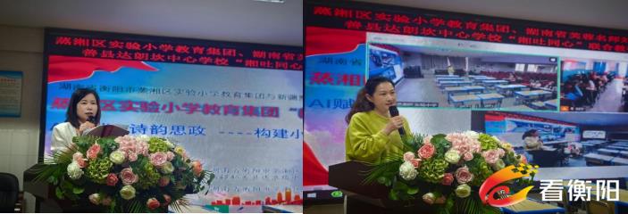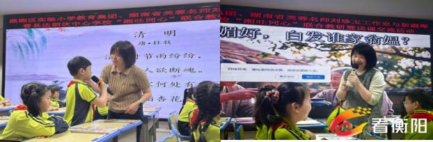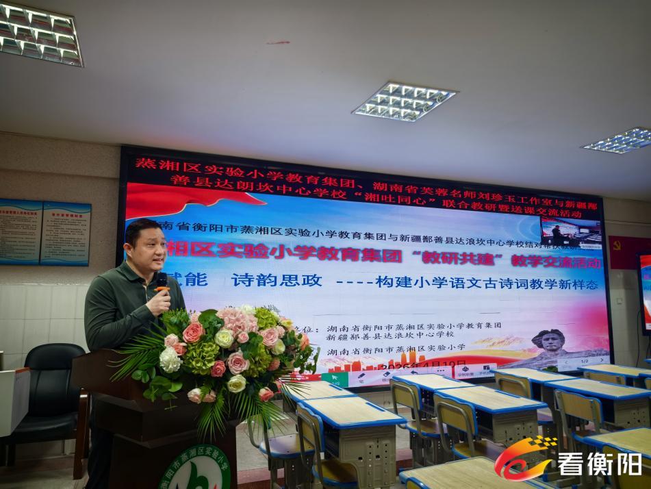 为深入推进“红石榴”“1+1”湘吐同心结对帮扶工作,搭建区域教育教学交流平台,探索小学语文古诗词教学创新路径,将现代科技、传统诗教与思政育人深度融合,2026年4月10日上午,在衡阳市蒸湘区实验小学开展了一场主题为“AI赋能·诗韵思政一一构建小学语文古诗词教学新样态”的联合教研活动。本次活动由蒸湘区实验小学教育集团、湖南省芙蓉教学名师刘珍玉工作室联合新疆鄯善县达浪坎中心校(线上)共同举办,两地教育工作者线下线上共研诗词教学,共话教育同心。