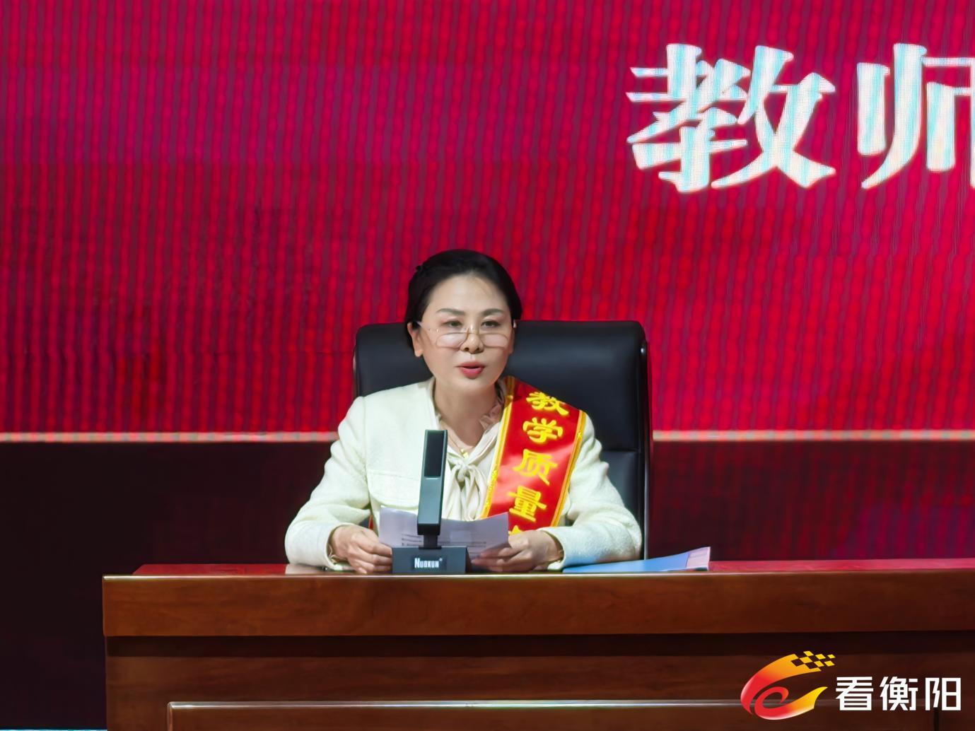 会议由教导主任胡丽衡主持并宣布开幕。党支部书记、校长陈瑾首先发表致辞,她代表学校领导班子向受表彰的先进个人与集体致以热烈祝贺,向全体一线教职工致以诚挚感谢。校长陈瑾强调,质量是学校生命线,本次会议以表彰先进、剖析问题、狠抓落实、再提质量为核心,既肯定了学校教学质量斩获的成绩,也直面班级发展不均、学业结构失衡、学风建设薄弱、智慧教学应用不足、培优补差缺位等突出问题,并围绕精准施策、狠抓落实提出明确要求,号召全体教师同心同德、实干笃行,全力打赢教学质量提升攻坚战。