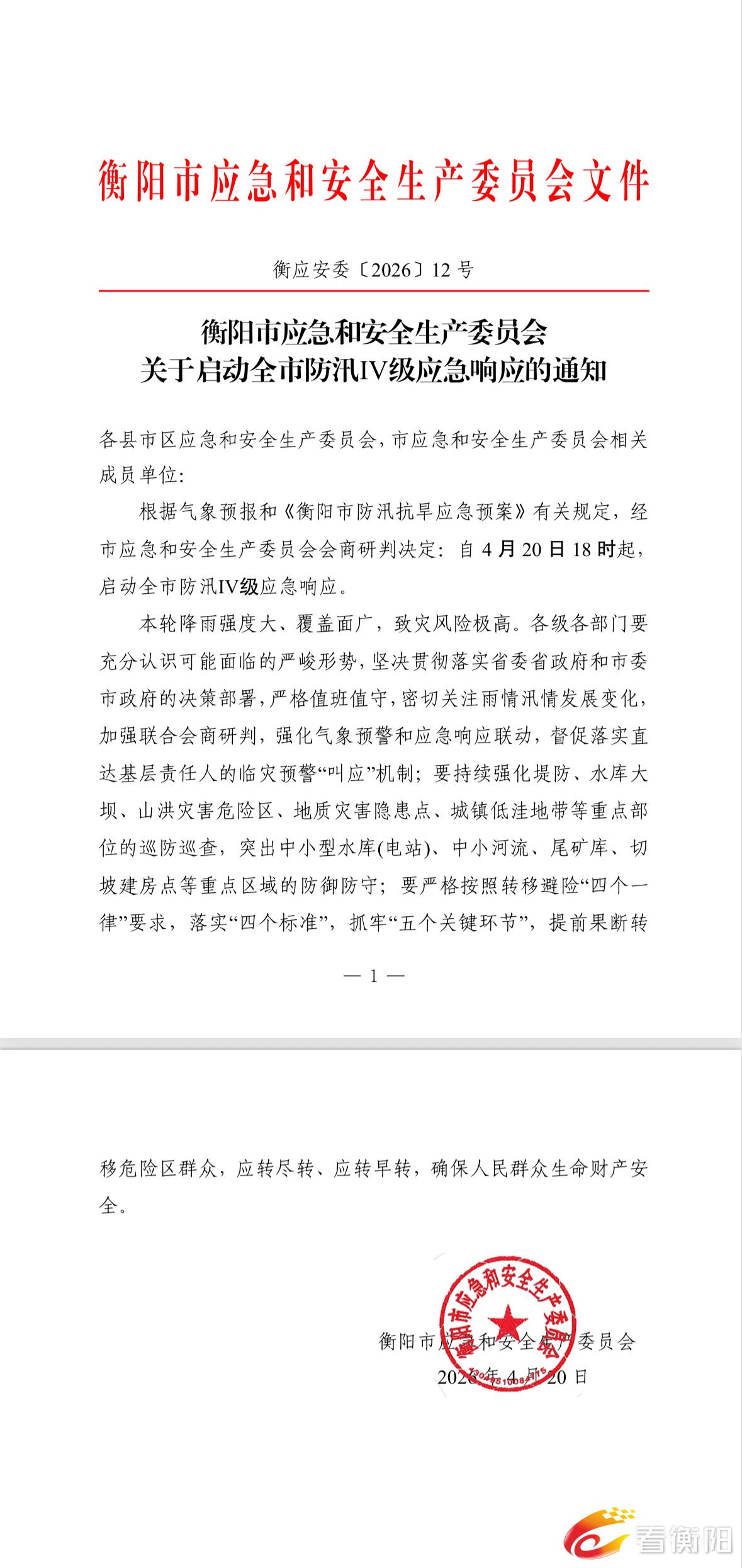 根据气象预报和《衡阳市防汛抗旱应急预案》有关规定,经市应急和安全生产委员会会商研判决定:自4月20日18时起,启动全市防汛Ⅳ级应急响应。