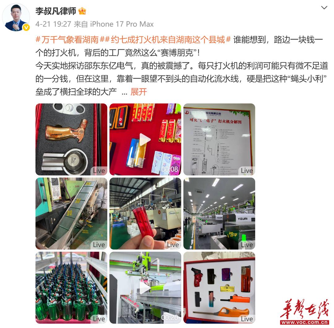 网络名人@李叔凡律师 在实地探访后感慨:“谁能想到,路边一块钱一个的打火机,背后的工厂竟然这么‘赛博朋克’!以前以为是靠人工‘搓’出来的,现场一看全是机械臂在跳舞。”
