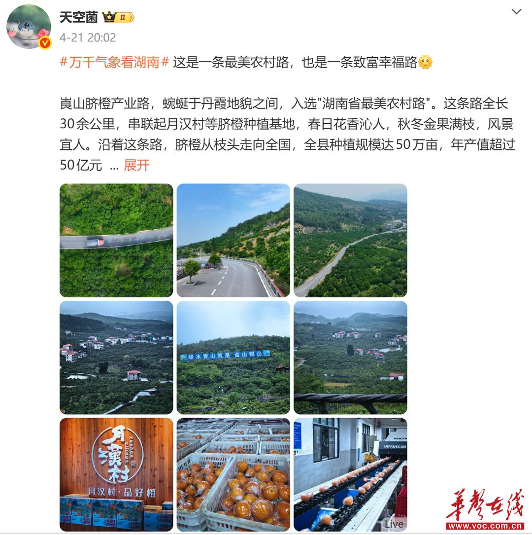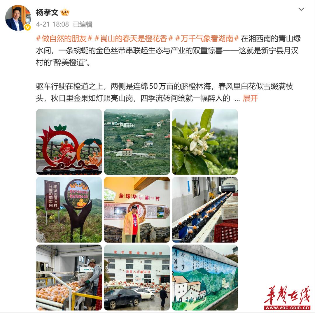 网络名人@杨孝文 激动地在橙道打卡:“生态保护与产业发展并非对立,而是可以相互成就的共生体。如今,这条‘醉美橙道’不仅是新宁的金色名片,更是乡村振兴路上的典范样本。”