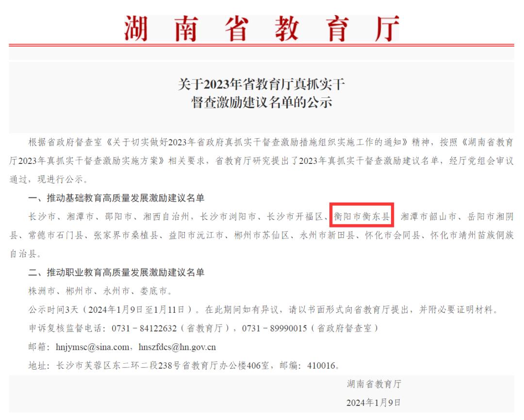 点赞!衡东县上榜2023年省教育厅真抓实干督查激励建议名单