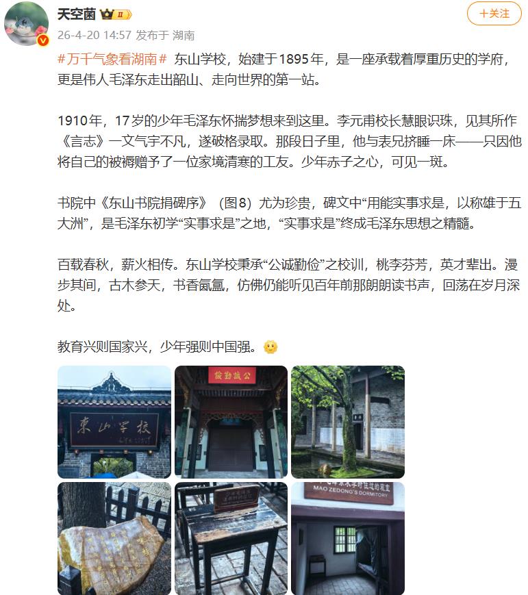 “东山学校,始建于1895年,是一座承载着厚重历史的学府,更是伟人毛泽东走出韶山、走向世界的第一站。”网络名人@天空菌 向1680万粉丝介绍了毛泽东在东山学校求学的故事:1910年,17岁的少年毛泽东怀揣梦想来到这里。李元甫校长慧眼识珠,见其所作《言志》一文气宇不凡,遂破格录取。那段日子里,他与表兄挤睡一床——只因他将自己的被褥赠予了一位家境清寒的工友。少年赤子之心,可见一斑。书院中《东山书院捐碑序》尤为珍贵,碑文中“用能实事求是,以称雄于五大洲”,是毛泽东初学“实事求是”之地,“实事求是”终成毛泽东思想之精髓。