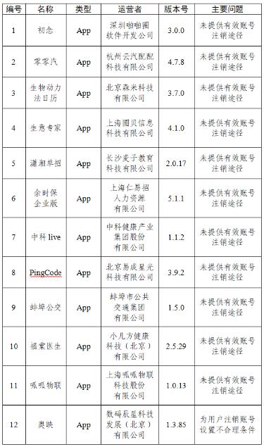 四、初念、零零汽等12款App未提供有效账号注销途径或为用户注销账号设置不合理条件(详见下表)。